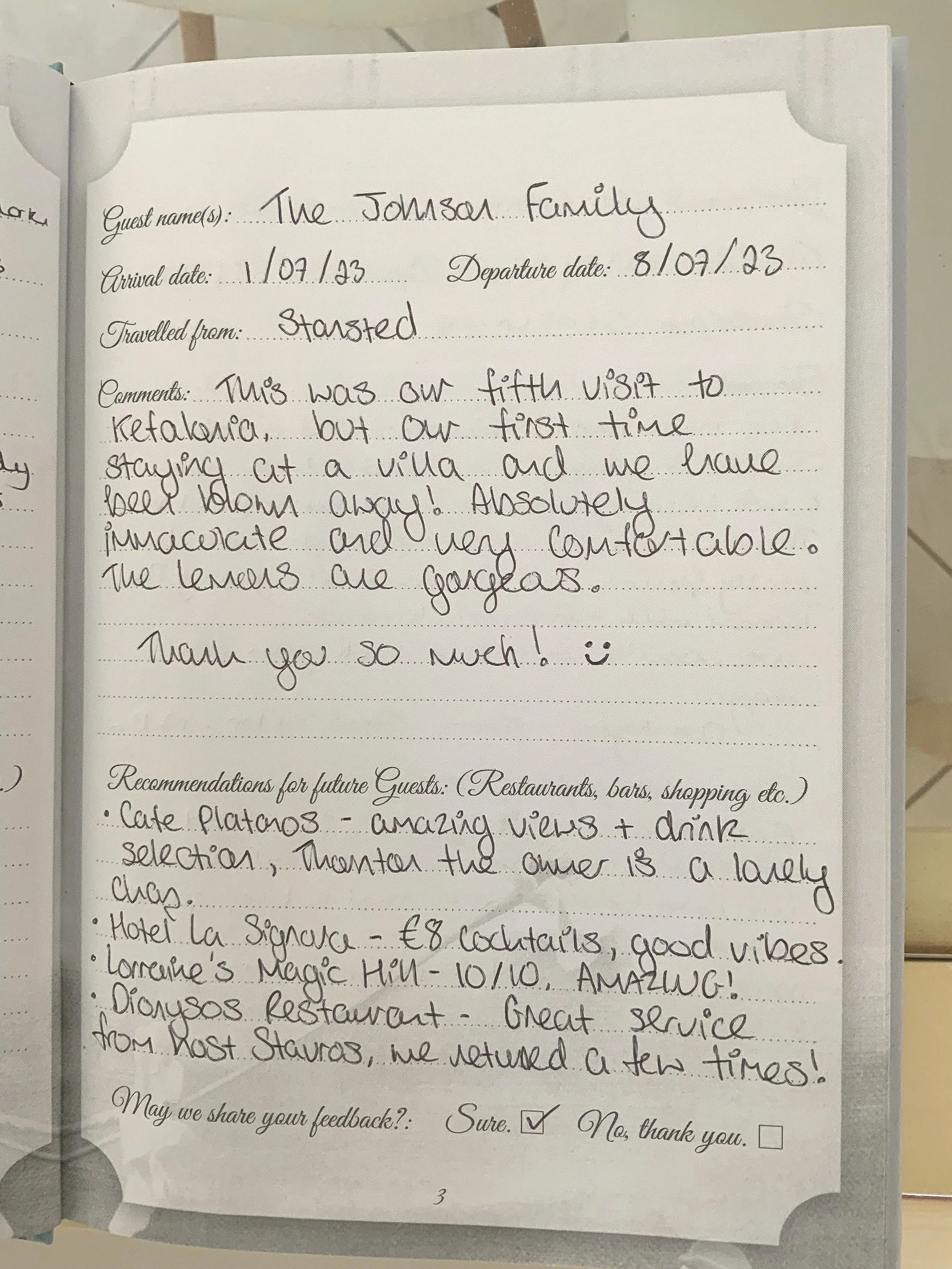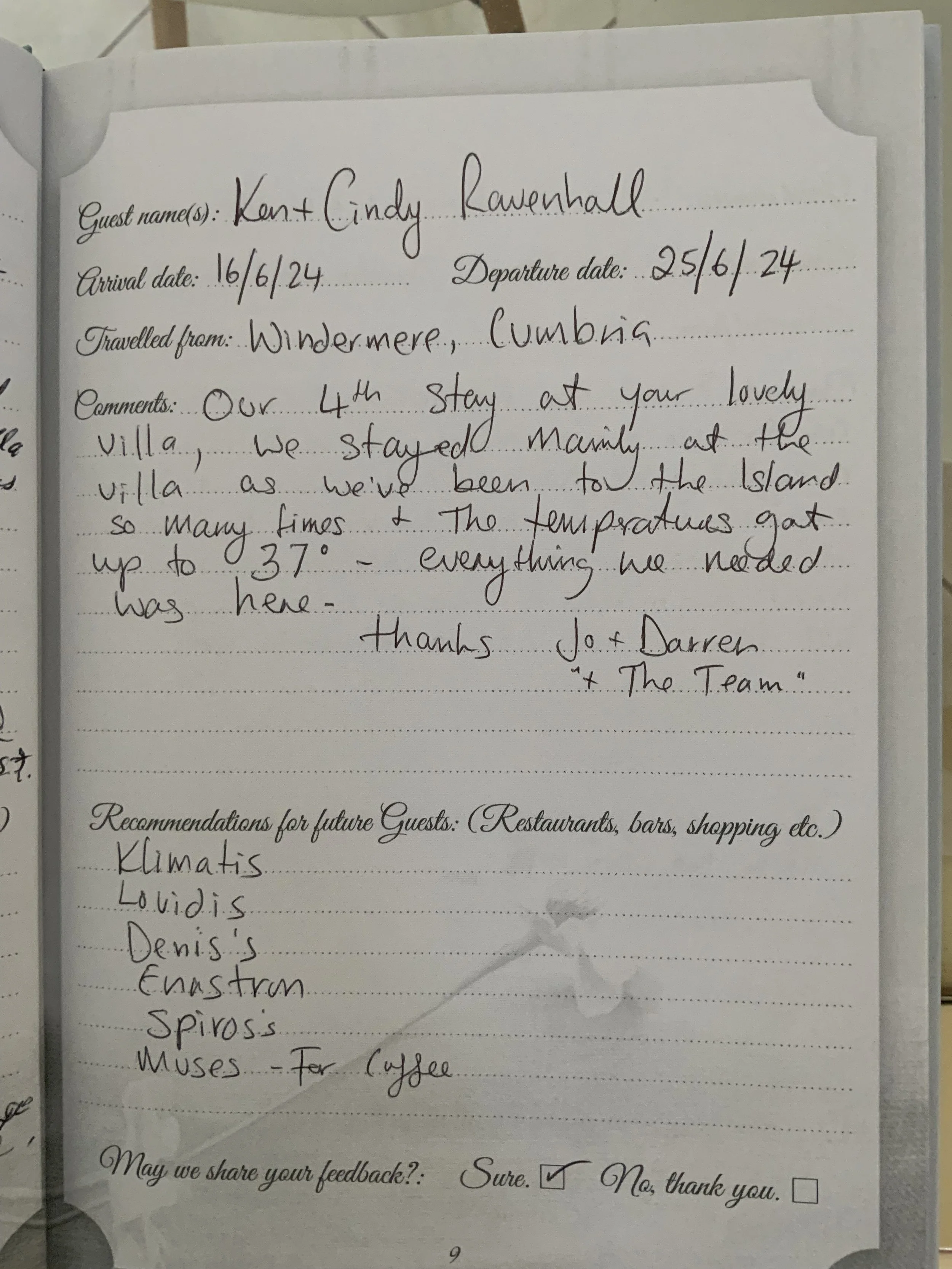 Equipping your villa has obviously been a labour of love. Thank you also for the ‘welcome pack’ it was invaluable for our first breakfast and Gren really enjoyed the MYthos beer when we arrived!