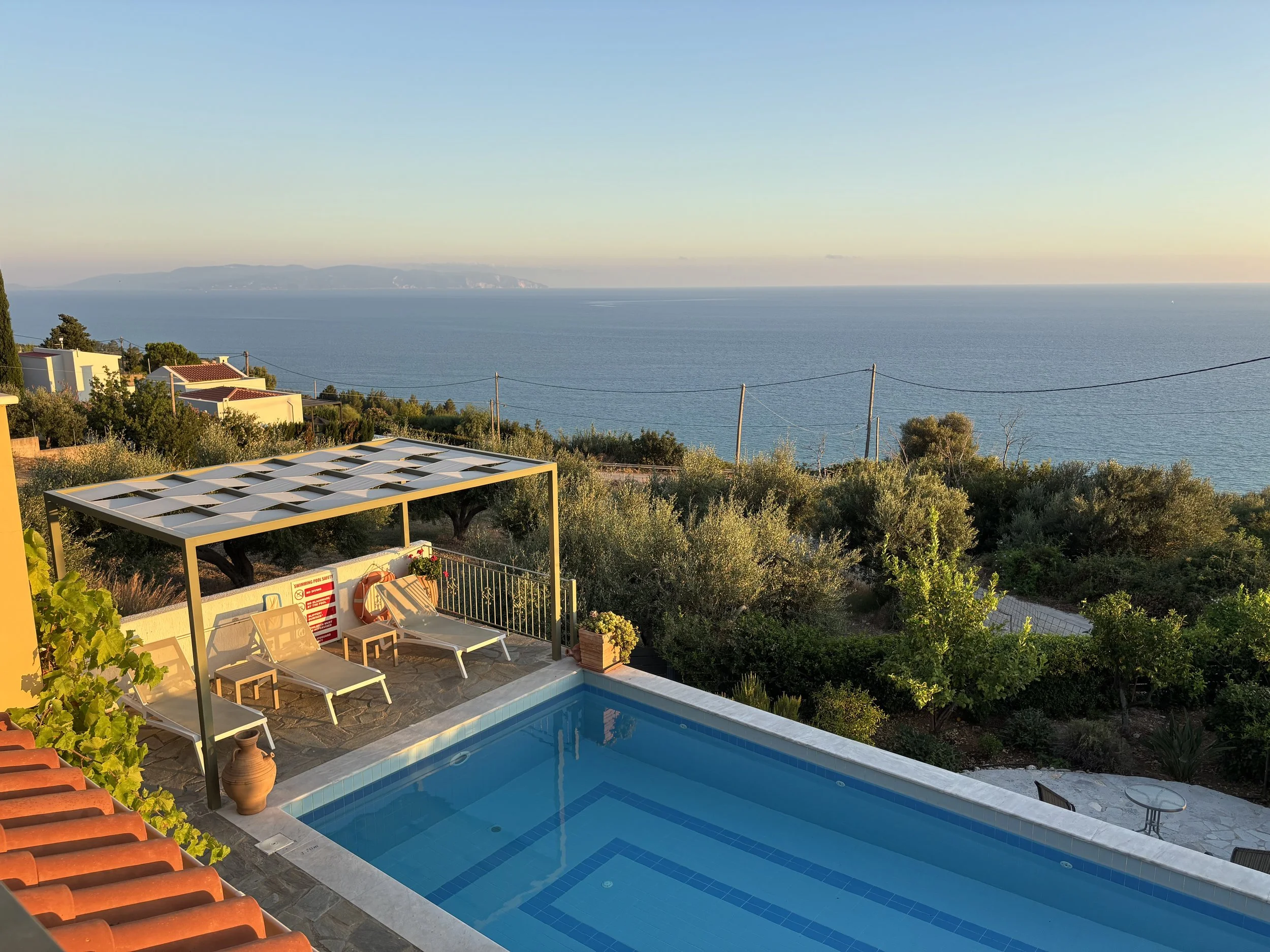 My wife, three teenage children and I have just returned from a fabulous two weeks in this completely and utterly fabulous villa! Sea views to the back (and from all 3 bedrooms) and mountain views to the front – just perfect. As per all the other comments – the villa is very well equipped and beautifully decorated. In the heat of Greece in August, we were particularly impressed with the villas air conditioning – which is highly efficient and astonishingly quiet. (It was very easy to sleep with the air-con on in the bedrooms). The pool is great for cooling off as well!